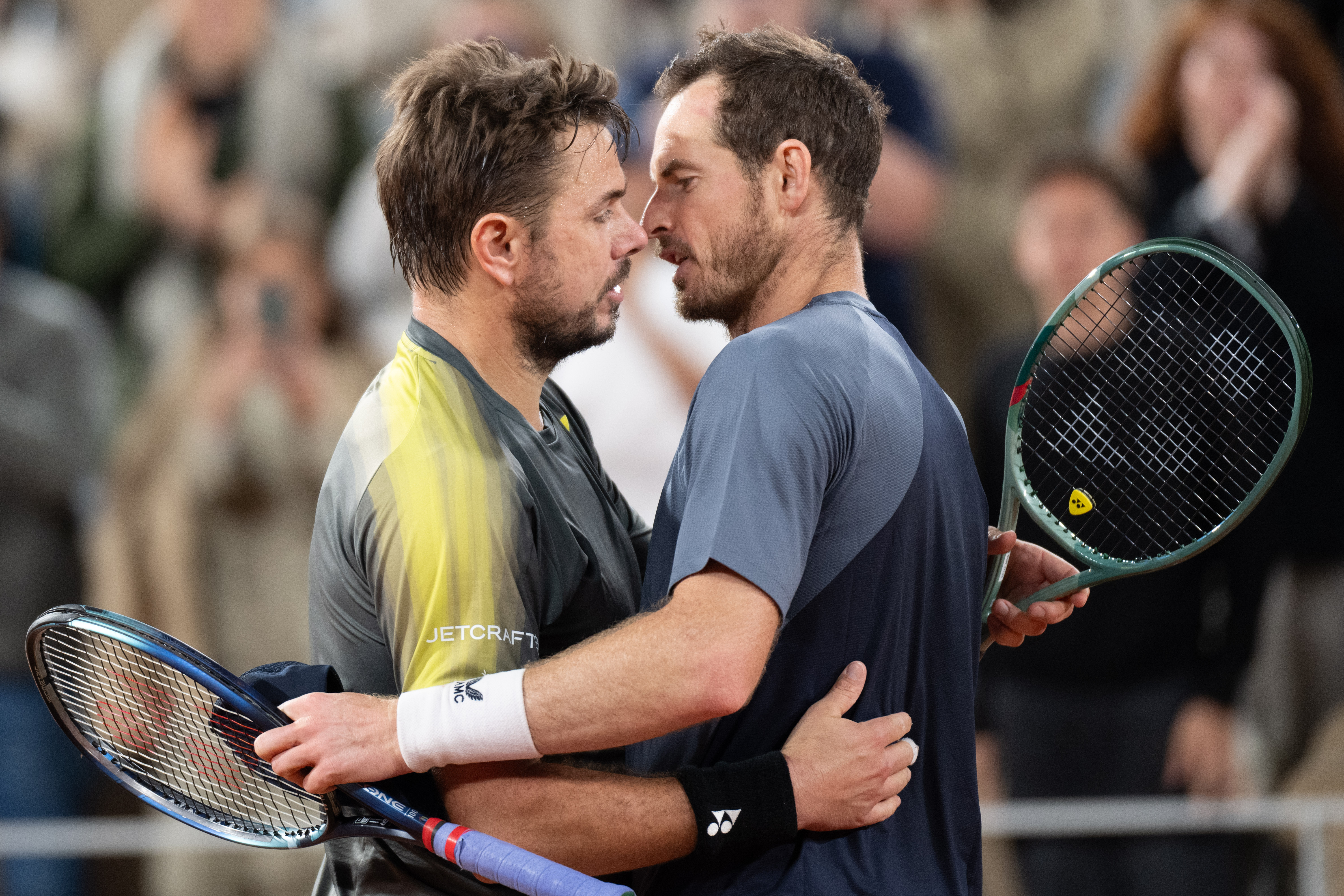5月26日,瓦林卡(左)与穆雷在比赛后拥抱。新华社记者 孟鼎博 摄