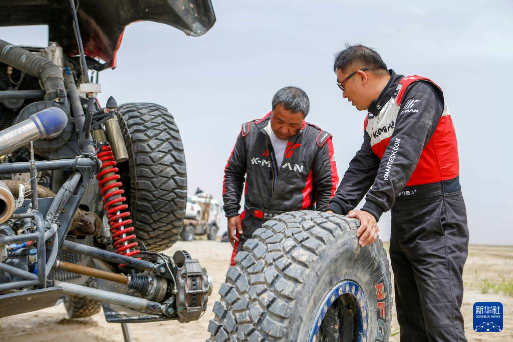 5月29日,K-MAN(中国)DO轮毂硬虎车队车手张立敬(右)、领航员钟世新在比赛中翻车后维修车辆。新华社记者 陈朔 摄