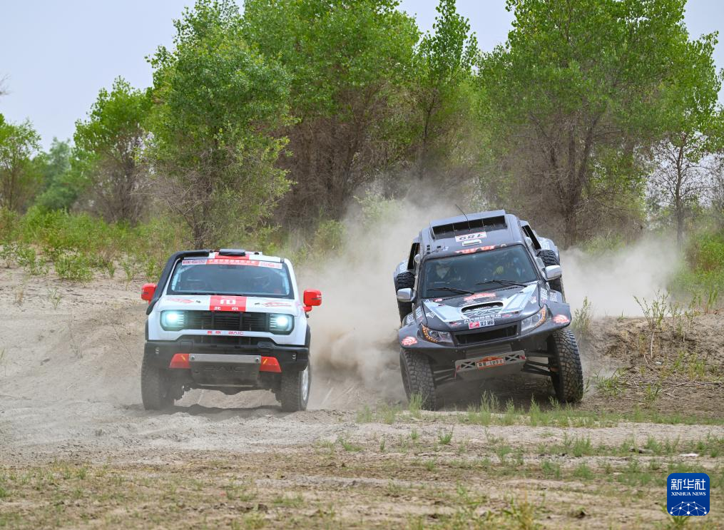 5月29日,北京汽车车队车手胡红德、领航员王平(左车)和北京市大兴区巨匠应急拉力车队车手张学峰、领航员陈利民(右车)驾驶赛车在比赛中。新华社记者 陈朔 摄