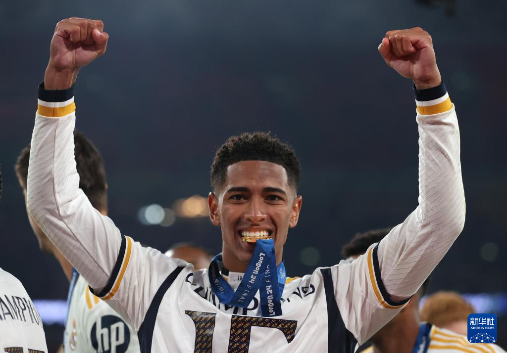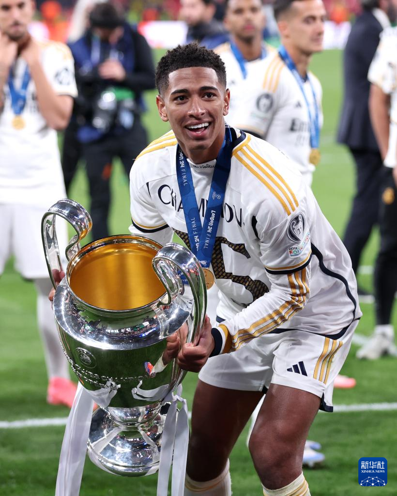 6月1日,皇家马德里队球员贝林厄姆捧杯庆祝。新华社发