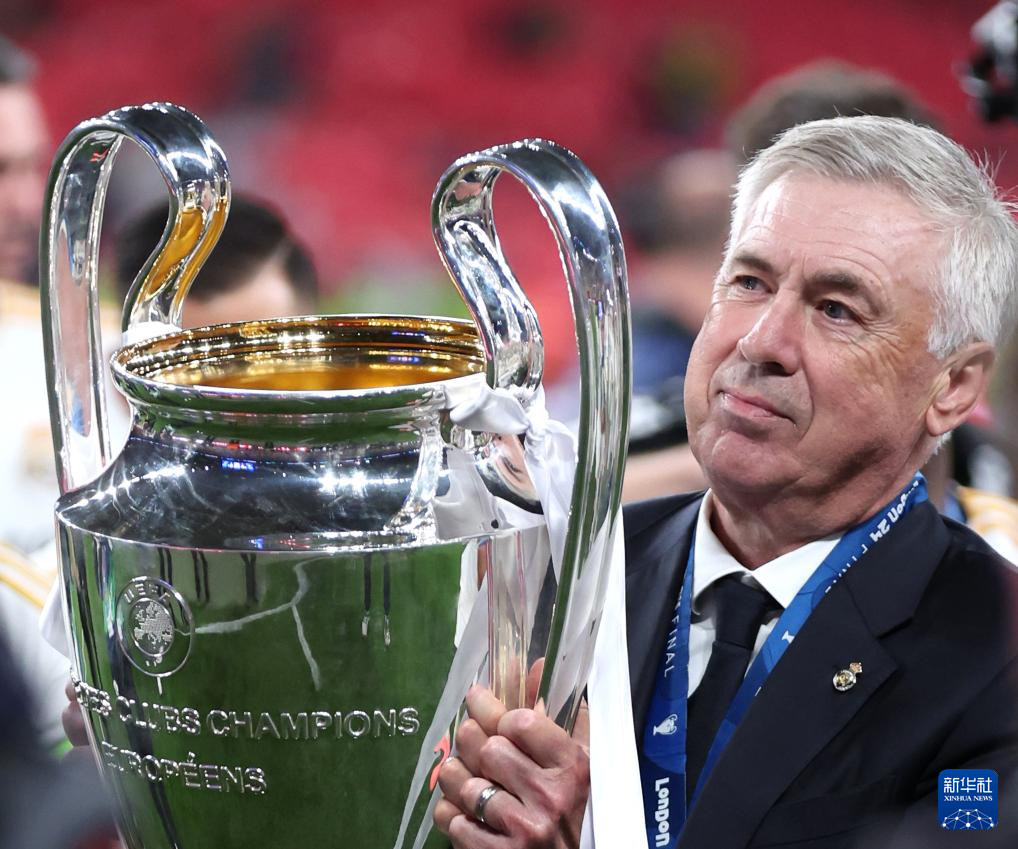 6月1日,皇家马德里队主教练安切洛蒂捧杯庆祝。新华社发