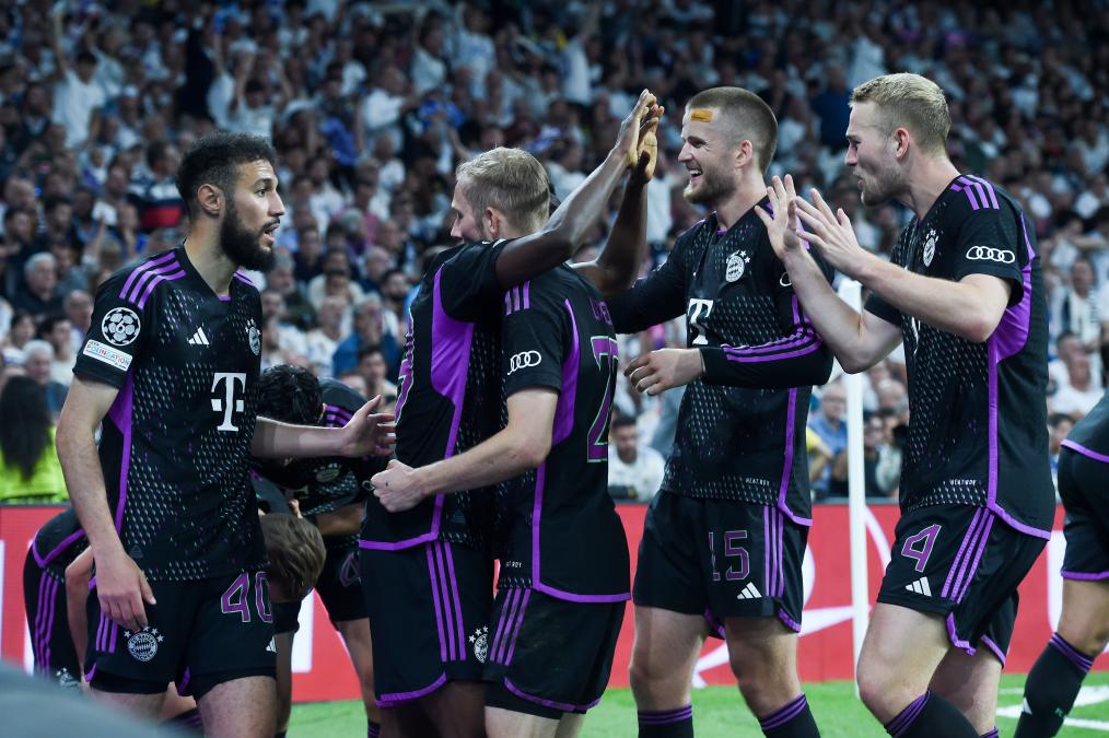 5月8日,拜仁慕尼黑队球员在2023-2024赛季欧冠半决赛次回合比赛中庆祝进球。新华社发(古斯塔沃·巴连特摄)