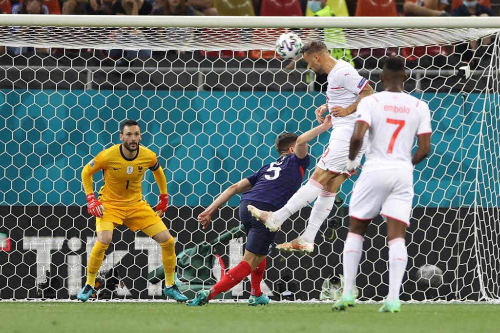 2021年6月28日,瑞士队球员塞费罗维奇(上)破门。当日,在欧锦赛八分之一决赛中,瑞士队淘汰法国队晋级八强。新华社/美联