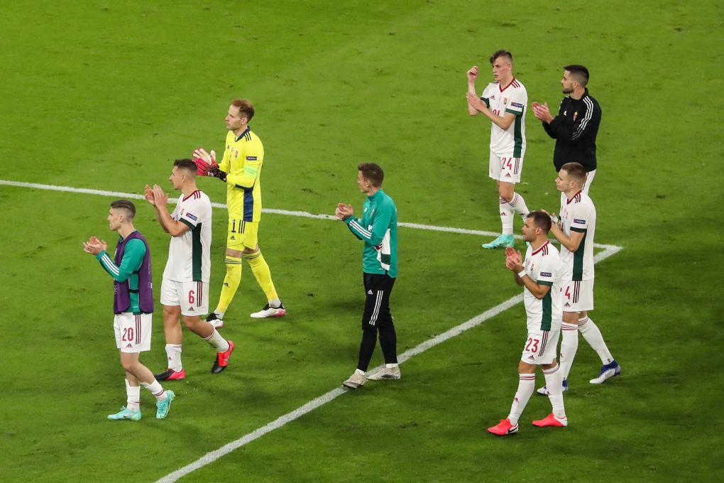 2021年6月23日,匈牙利队球员在比赛后向球迷致意。当日,在欧锦赛F组小组赛中,德国队以2:2战平匈牙利队,以小组第二名晋级16强。新华社记者 单宇琦 摄