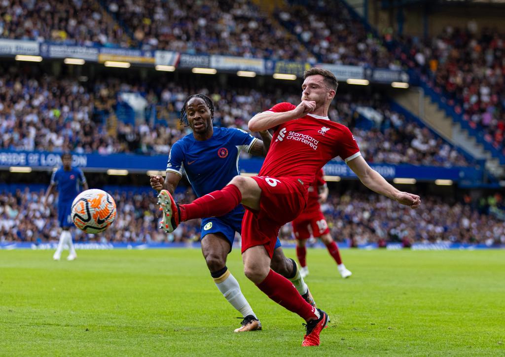 2023年8月13日,利物浦队球员罗伯逊(右)与切尔西队球员斯特林在英超比赛中拼抢。新华社发