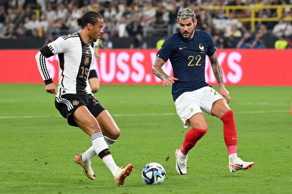 2023年9月12日,德国队球员萨内(左)与法国队球员埃尔南德斯在友谊赛拼抢,当日德国队2:1战胜法国队。新华社发(乌尔里希·胡夫纳格尔 摄)