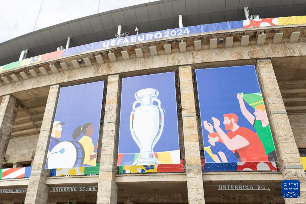 这是6月7日拍摄的柏林奥林匹克体育场外墙悬挂的2024年欧锦赛海报。