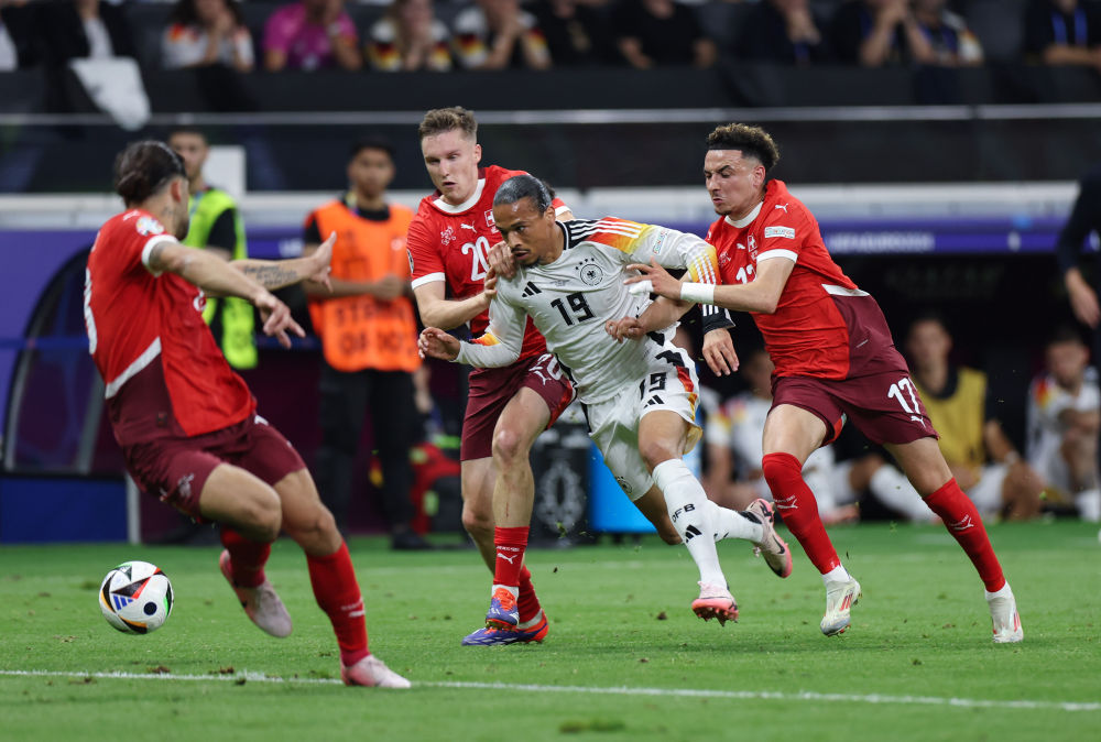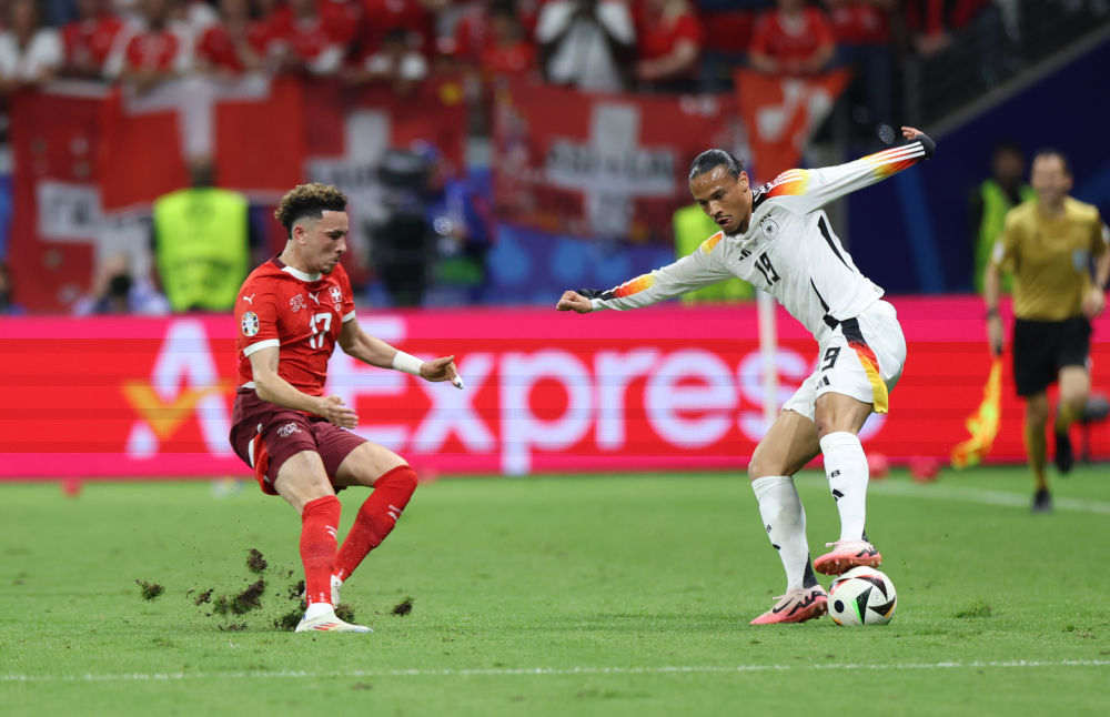 6月23日,德国队球员萨内(右)突破瑞士队球员巴尔加斯的防守。新华社记者 白雪飞 摄