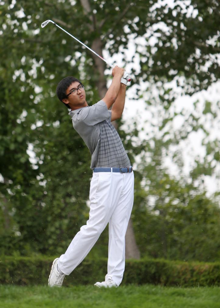 图为2017年9月2日,第十三届全运会高尔夫球项目男子团体第一轮比赛,北京队选手窦泽成在比赛中挥杆。新华社记者 张誉东 摄