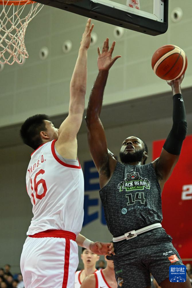 6月26日,中国队球员余嘉豪(左)防守澳门黑熊队球员迈尔斯。新华社发(王须中摄)