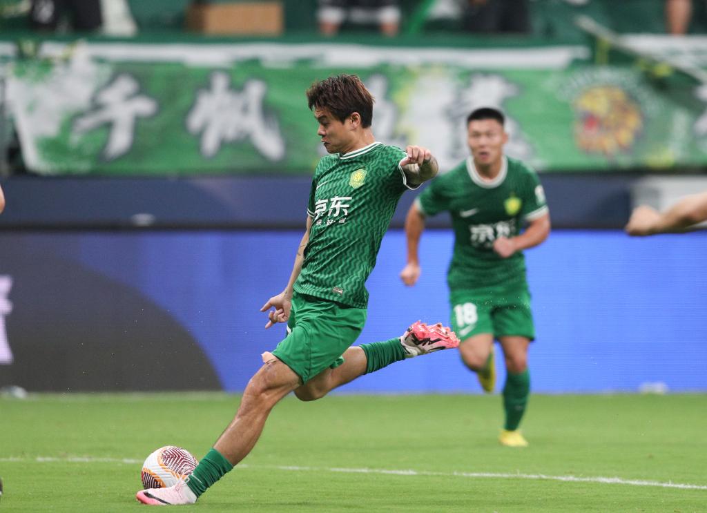 6月26日,北京国安队球员杨立瑜射门得分。新华社记者 许雅楠 摄