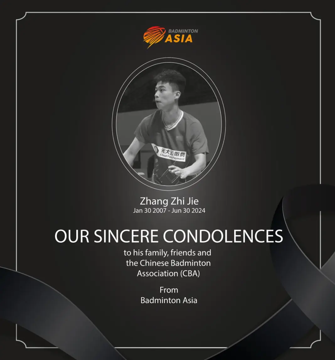 “亚洲羽毛球联合会、印尼羽毛球协会和组委会对此深表悲痛,并向张志杰的父母、家人和中国羽毛球协会表示最深切的慰问。”公告中写道,“世界羽坛失去了一位富有天赋的选手。”