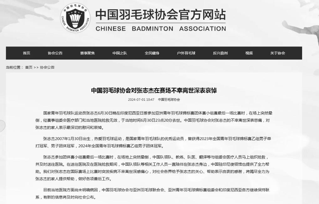 新华社北京7月1日电(记者丁文娴、姬烨、夏亮)中国青年羽毛球队运动员张志杰6月30日在印度尼西亚日惹参加亚洲青年羽毛球锦标赛团体赛小组赛最后一场比赛时,在场上突然晕倒,此后经抢救无效去世。亚洲羽毛球联合会、中国羽毛球协会等多方发布公告,对张志杰的不幸离世深表哀悼。