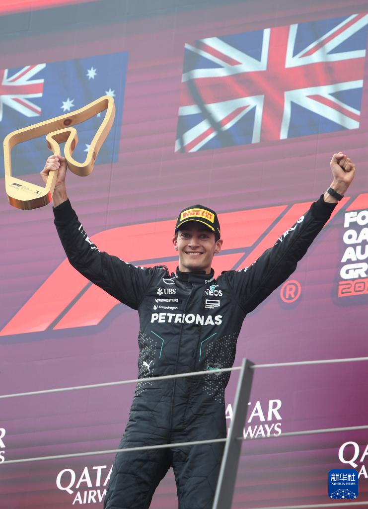 6月30日,梅赛德斯车队英国车手拉塞尔在颁奖仪式上庆祝夺冠。新华社记者 贺灿铃 摄