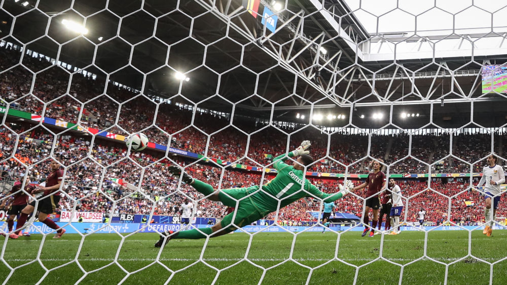 7月1日,比利时队守门员卡斯蒂尔斯在比赛中未能扑救出队友维尔通亨(左二)打进的乌龙球。新华社记者 潘昱龙 摄