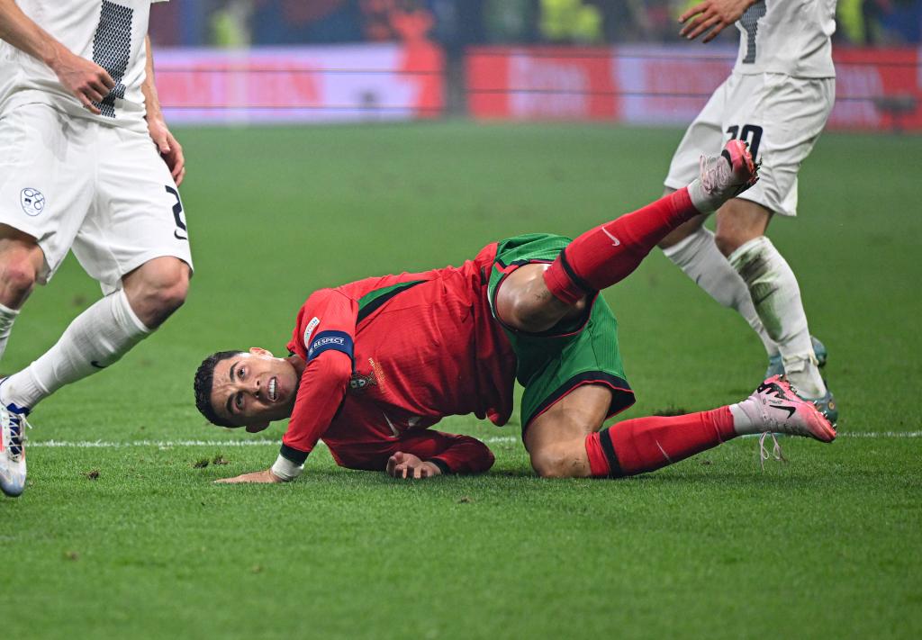 7月1日,葡萄牙队球员克·罗纳尔多在2024欧洲足球锦标赛八分之一决赛中倒地。新华社记者 任鹏飞 摄