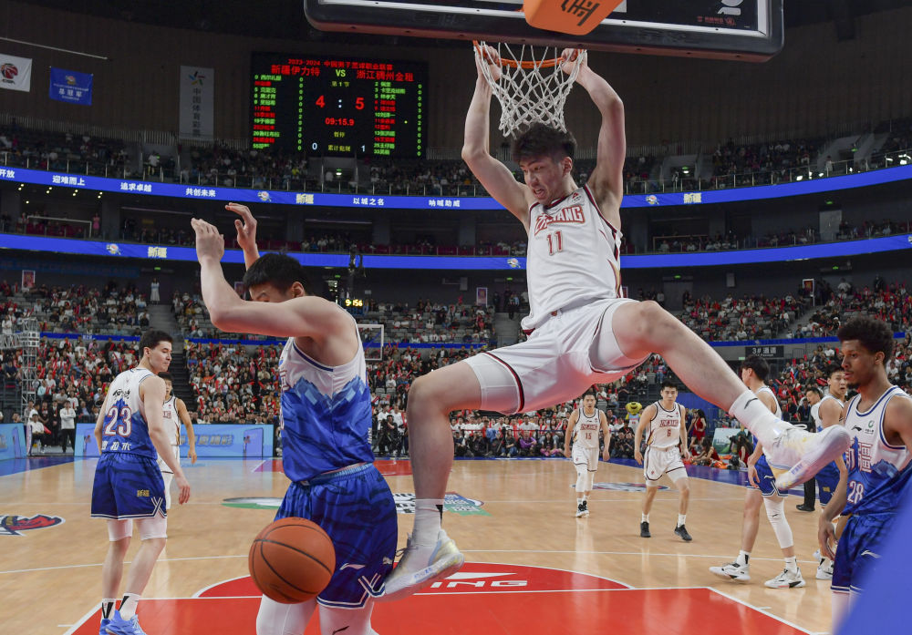 5月4日,浙江稠州队球员余嘉豪(上)在2023-2024赛季中国男子篮球职业联赛(CBA)季后赛半决赛第二回合比赛中扣篮。新华社记者 王菲 摄