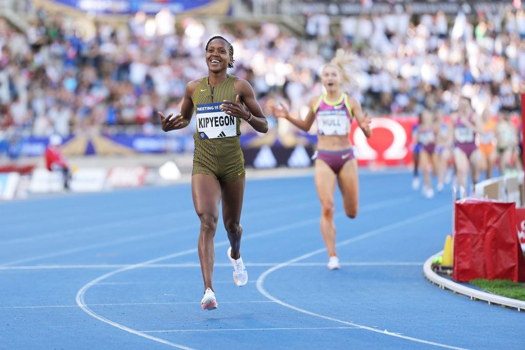 去年的钻石联赛巴黎站比赛中,基普页真曾创造女子5000米世界纪录。此次她参加的项目是1500米。在配速员的引领下,肯尼亚人前800米用时2分4秒,随后配速员退出赛道,基普页真速度不减,最终她以3分49秒04的成绩率先撞线,将自己去年在钻石联赛佛罗伦萨站创造的世界纪录提升了0.07秒。