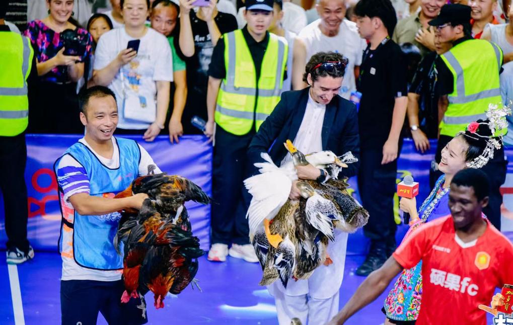 7月6日,闭幕式上人们在进行抓鸡抓鸭大作战。(新华社发)