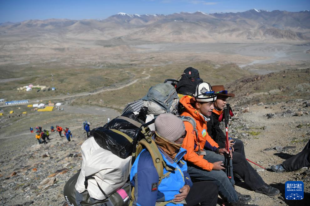 7月4日,上山途中,塔西巴伊(中)和同伴在海拔约4400米的休息点小憩,身后的登山队伍正缓缓而上。新华社记者 胡虎虎 摄