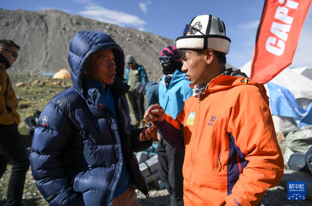 7月4日,登山队伍即将出发,新疆登山协会慕士塔格峰登山领队李渊(左)向塔西巴伊叮嘱搬运物品的放置营地和其他安全事项。新华社记者 胡虎虎 摄