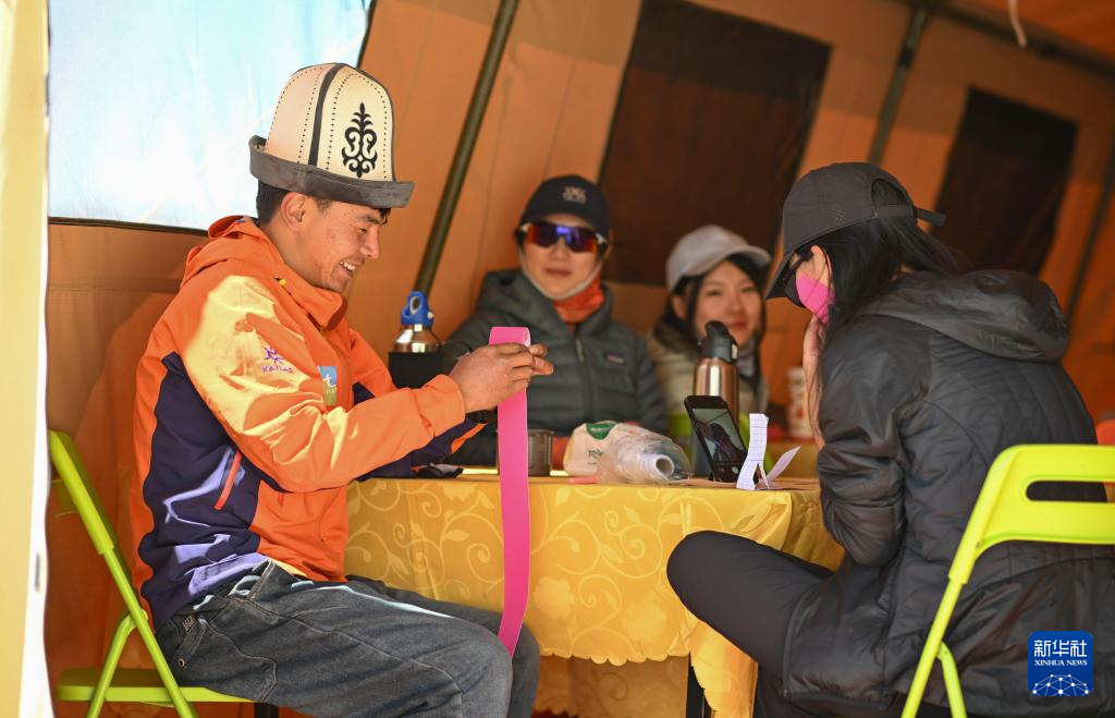 7月3日,在新疆慕士塔格峰一处登山营地,塔西巴伊与登山者们一起准备防晒贴。新华社记者 胡虎虎 摄