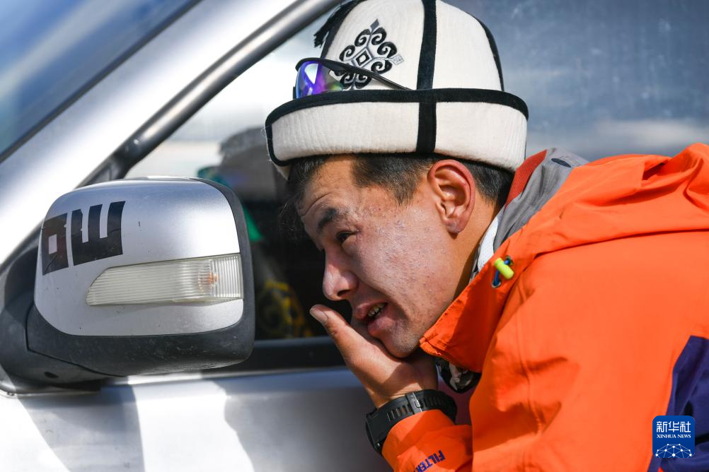 7月4日,登山队伍即将出发上山,塔西巴伊对着汽车后视镜涂抹防晒霜。新华社记者 胡虎虎 摄
