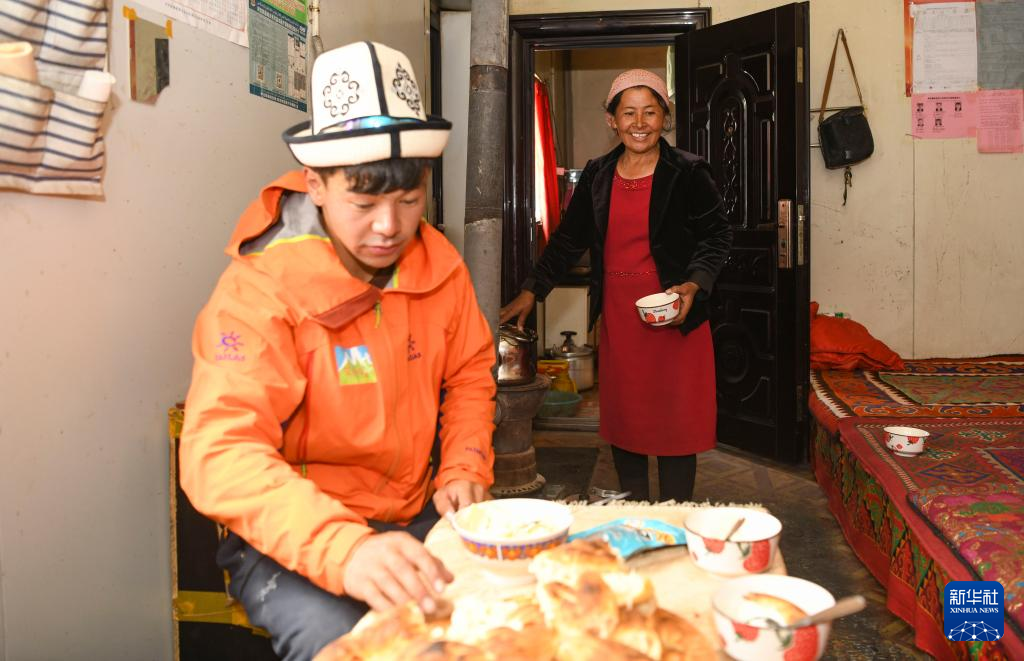 7月5日,塔西巴伊下山后回到家,母亲为他准备了奶茶、馕、酸奶等美食。新华社记者 胡虎虎 摄