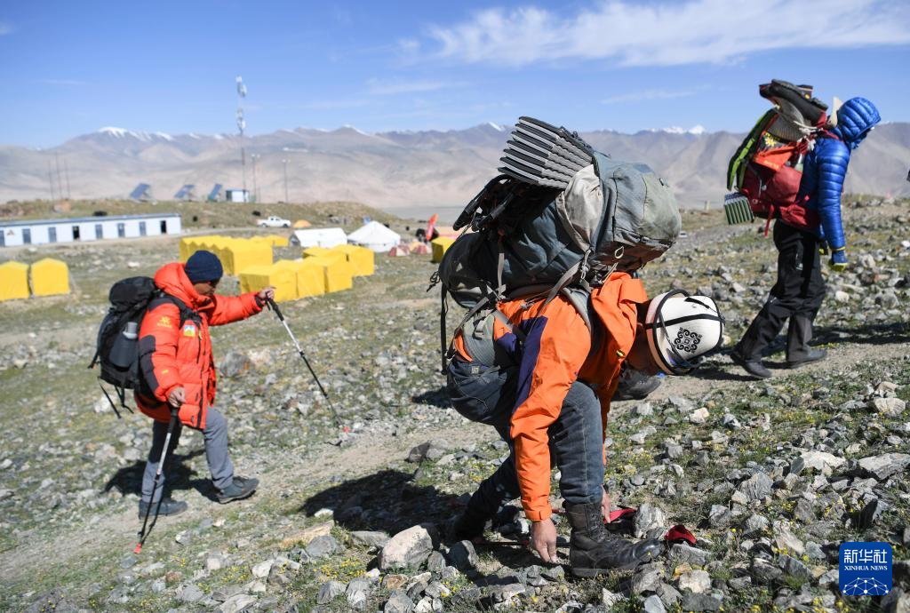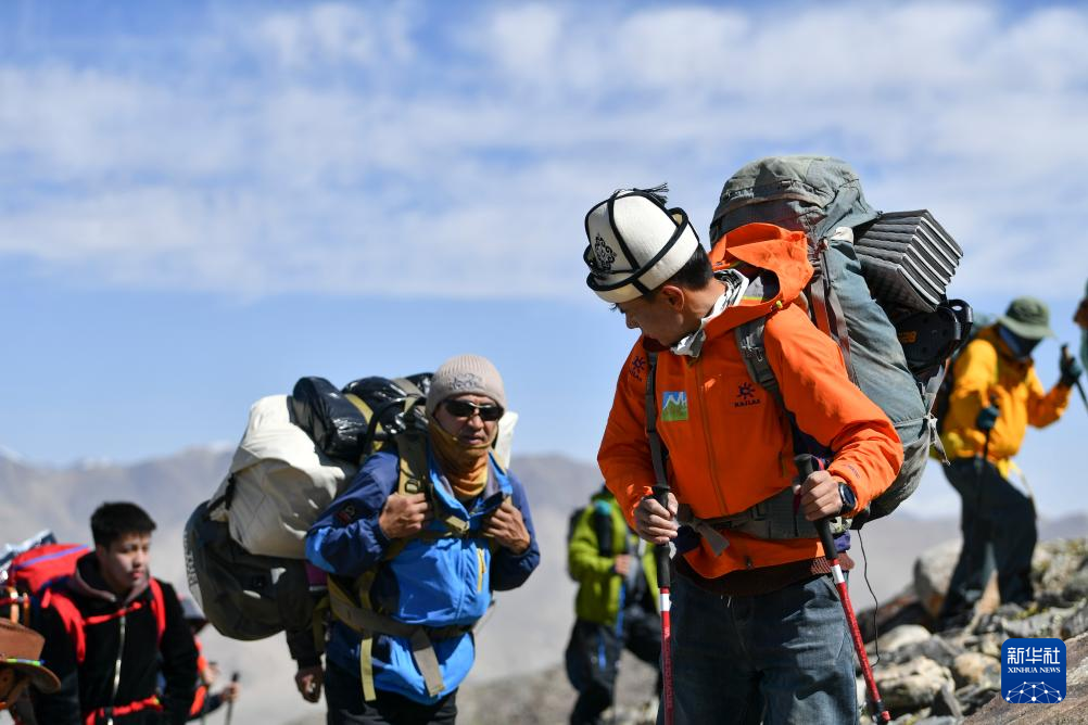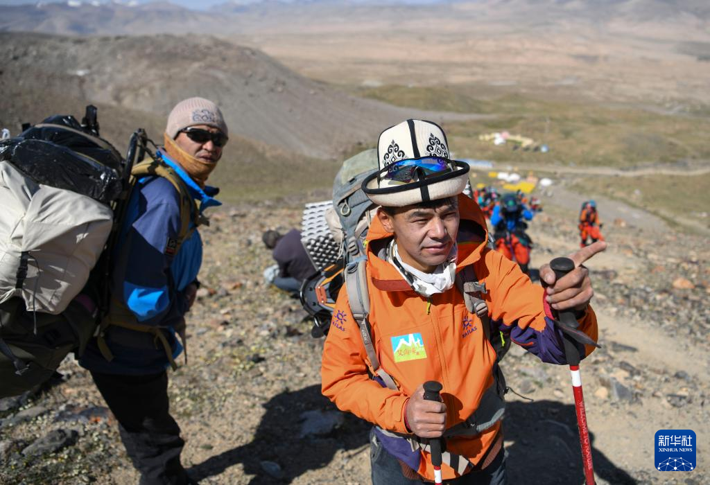 7月4日,塔西巴伊(左二)背着约25公斤的物品和同伴一起行进在慕士塔格峰的山坡上。新华社记者 胡虎虎 摄