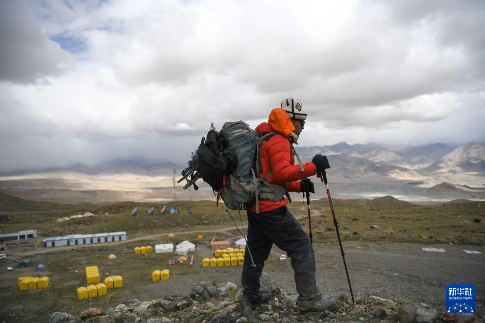 7月5日,完成一次海拔约5670米的慕士塔格峰C1营地物品转运后,塔西巴伊在下山途中。新华社记者 胡虎虎 摄