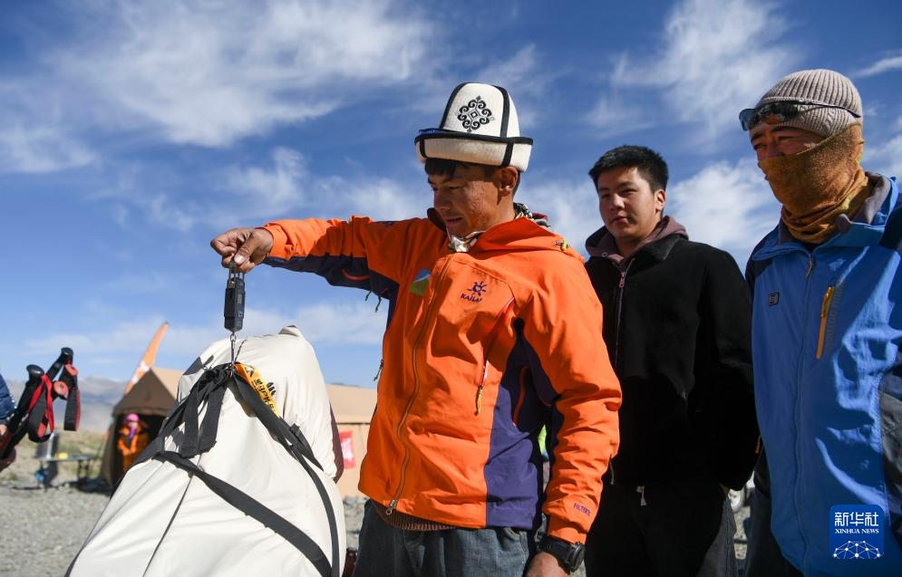 7月4日,在新疆慕士塔格峰一处登山营地,塔西巴伊(左)将登山者的物品称重。高山搬运依据不同海拔路程对所背物品按重量收取费用。新华社记者 胡虎虎 摄