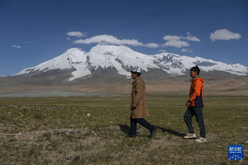 7月6日,塔西巴伊(右)和父亲加尼拜克路过慕士塔格峰脚下的牧场。新华社记者 胡虎虎 摄