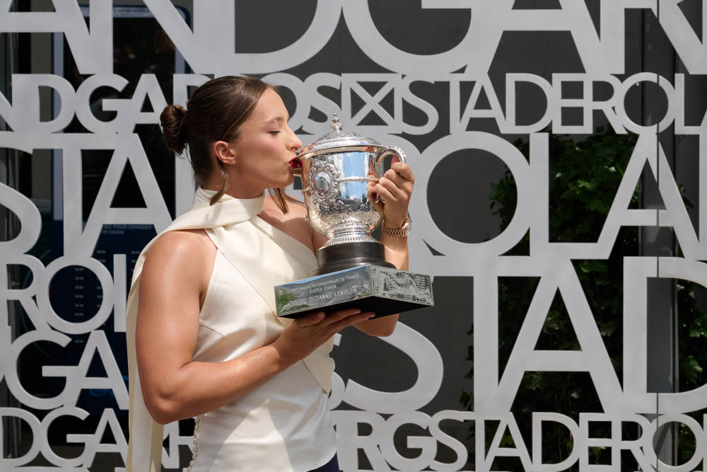6月9日,斯维亚特克捧杯留影。当日,2024年法国网球公开赛女子单打冠军、波兰选手斯维亚特克在巴黎罗兰加洛斯体育场与冠军奖杯合影留念。新华社记者 孟鼎博 摄