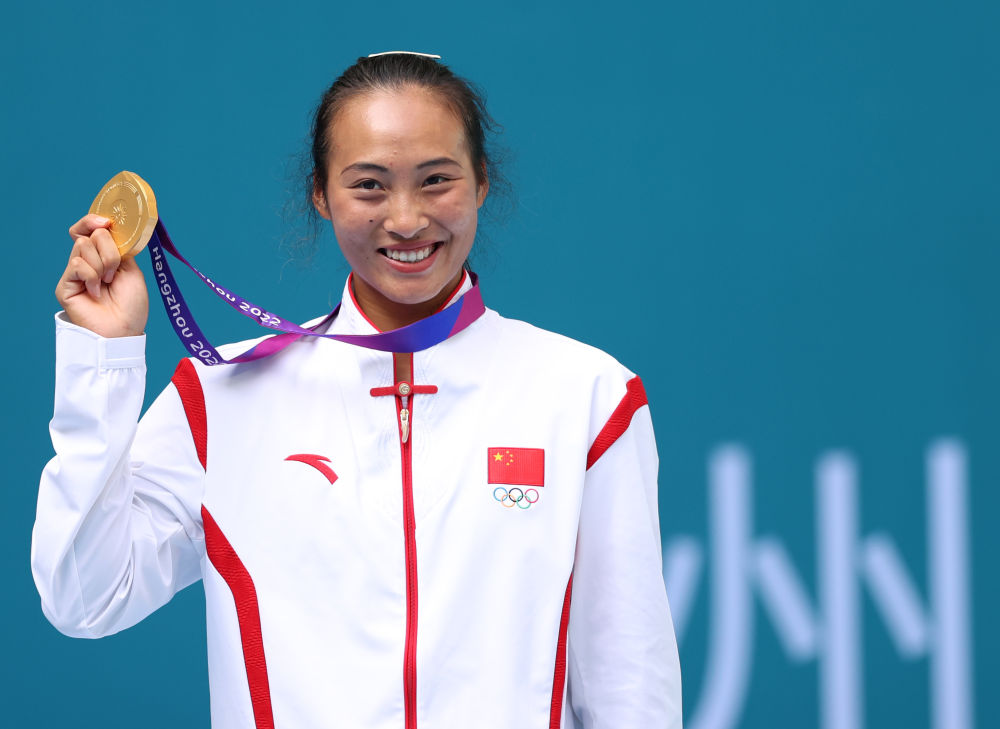 9月29日,冠军中国选手郑钦文在颁奖仪式上庆祝。当日,在浙江杭州奥体中心网球中心进行的杭州亚运会网球女子单打决赛中,中国选手郑钦文以2比0战胜队友朱琳,夺得冠军。新华社记者 贾浩成 摄