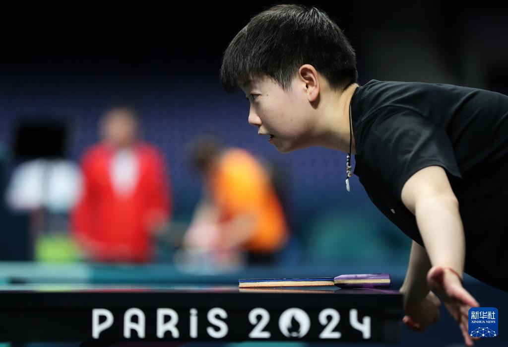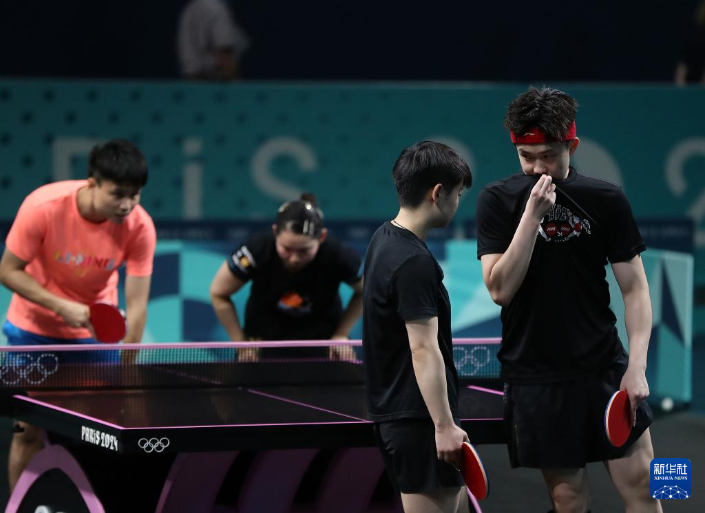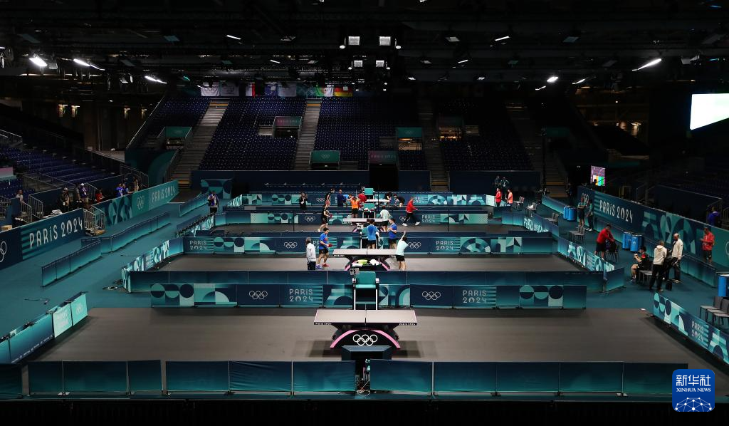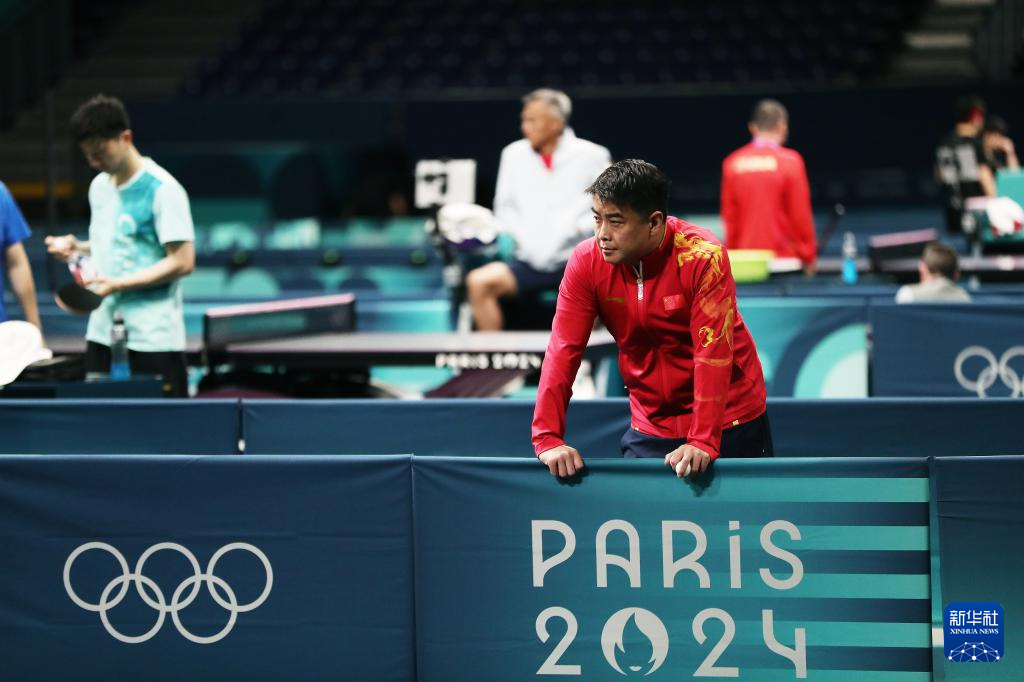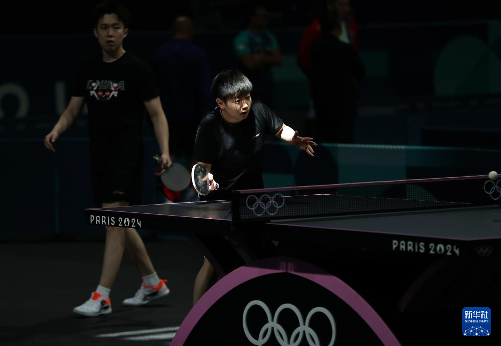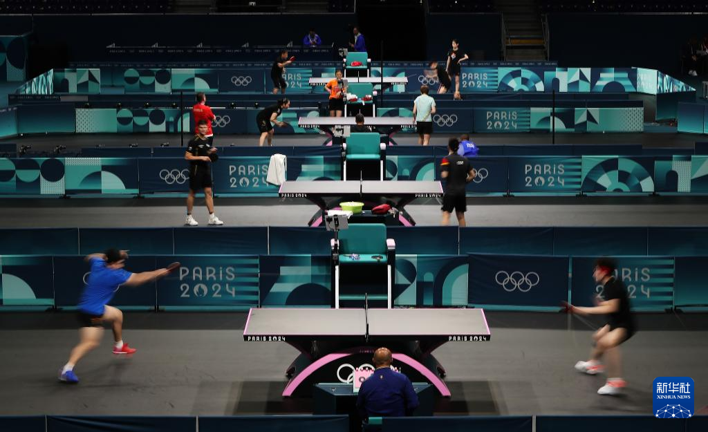 当日,中国国家乒乓球队在南巴黎竞技场进行赛前训练。巴黎奥运会乒乓球项目将于7月27日迎来首个比赛日。