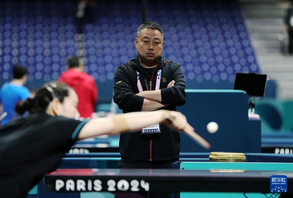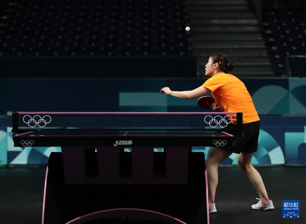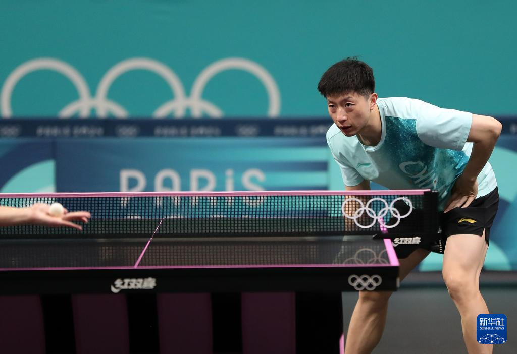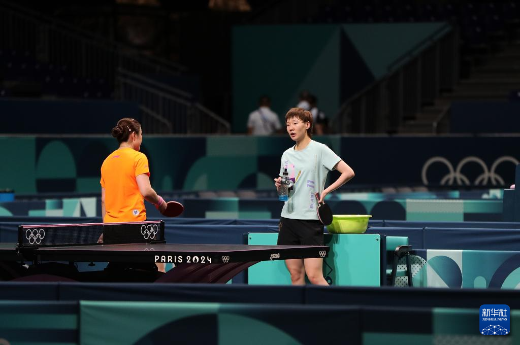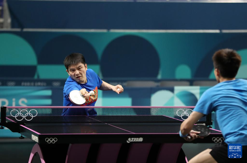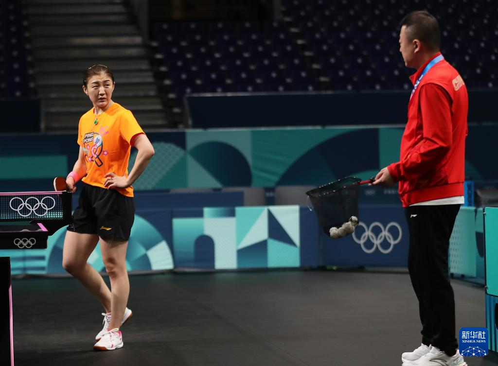 当日,中国国家乒乓球队在南巴黎竞技场进行赛前训练。巴黎奥运会乒乓球项目将于7月27日迎来首个比赛日。