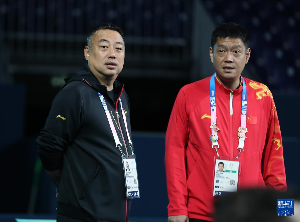 7月22日,中国乒乓球协会主席刘国梁(左)与教练邱贻可交流。新华社记者 王东震 摄