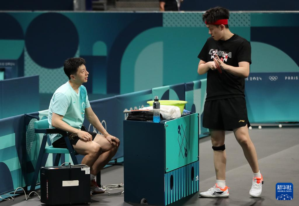 7月22日,马龙(左)和王楚钦在训练间隙交流。新华社记者 王东震 摄