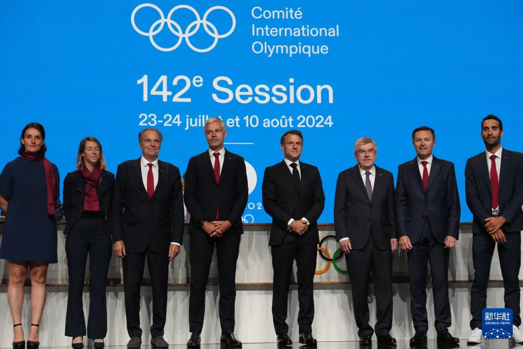 7月24日,法国总统马克龙(右四)、国际奥委会主席巴赫(右三)等在会议现场合影。新华社记者 孟鼎博 摄