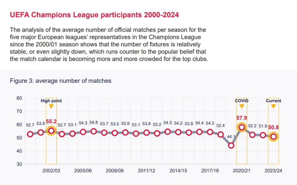 在俱乐部层面看,近12个赛季,各俱乐部参赛平均场次同样稳定,保持在42场左右。报告对2000年至2024年间所有参加欧冠联赛的俱乐部当赛季全部比赛场次进行统计,2023-2024赛季各队平均参赛50.8场,甚至要低于2002-2003赛季的55.2场。