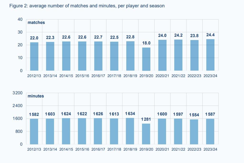 报告指出,近12个赛季,球员平均每赛季参加22.7场比赛。除去受疫情影响的2019-2020赛季外,其余赛季则基本维持在22场至24场之间。最高是2023-2024赛季,球员平均出场24.4场比赛。虽然上赛季球员平均出场数比过去有小幅上涨,但由于从2020赛季起每场换人名额从三个增加至五个,每名球员赛季平均出场时间在近12个赛季保持稳定,维持在1600分钟左右。