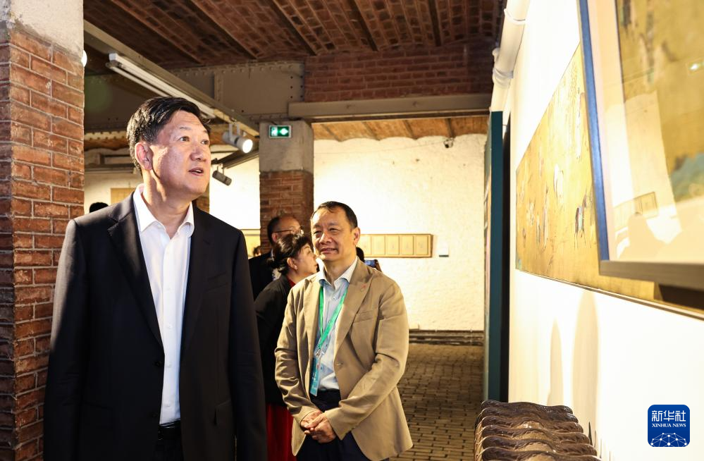 7月23日,中国奥委会主席高志丹(左)在开幕式上欣赏展品。新华社记者 张帆 摄