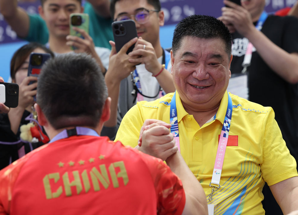 ↑国际射联副主席、中国射击奥运冠军王义夫(右)在比赛后庆祝。
