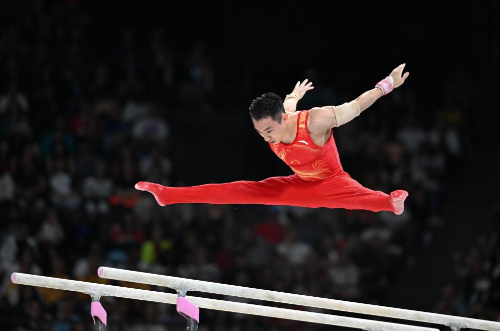 7月27日,中国选手邹敬园在双杠比赛中。新华社记者 程敏 摄