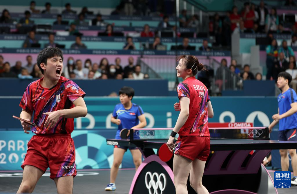 7月27日,张本智和(左)/早田希娜在比赛中庆祝得分。新华社记者 王东震 摄