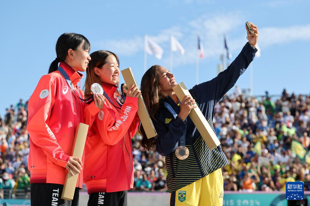 7月28日,冠军日本选手吉泽恋(中)、亚军日本选手赤间凛音(左)与季军巴西选手蕾莎·莱亚尔在颁奖仪式上合影。新华社记者 朱峥 摄
