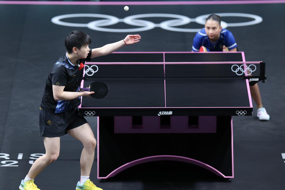 7月28日,孙颖莎(左)在比赛中发球。新华社记者 刘续 摄
