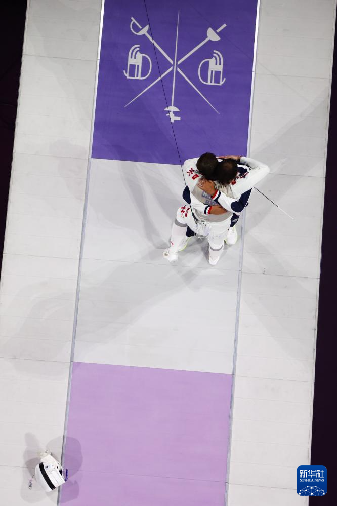 7月29日,中国香港选手张家朗(右)庆祝获胜。