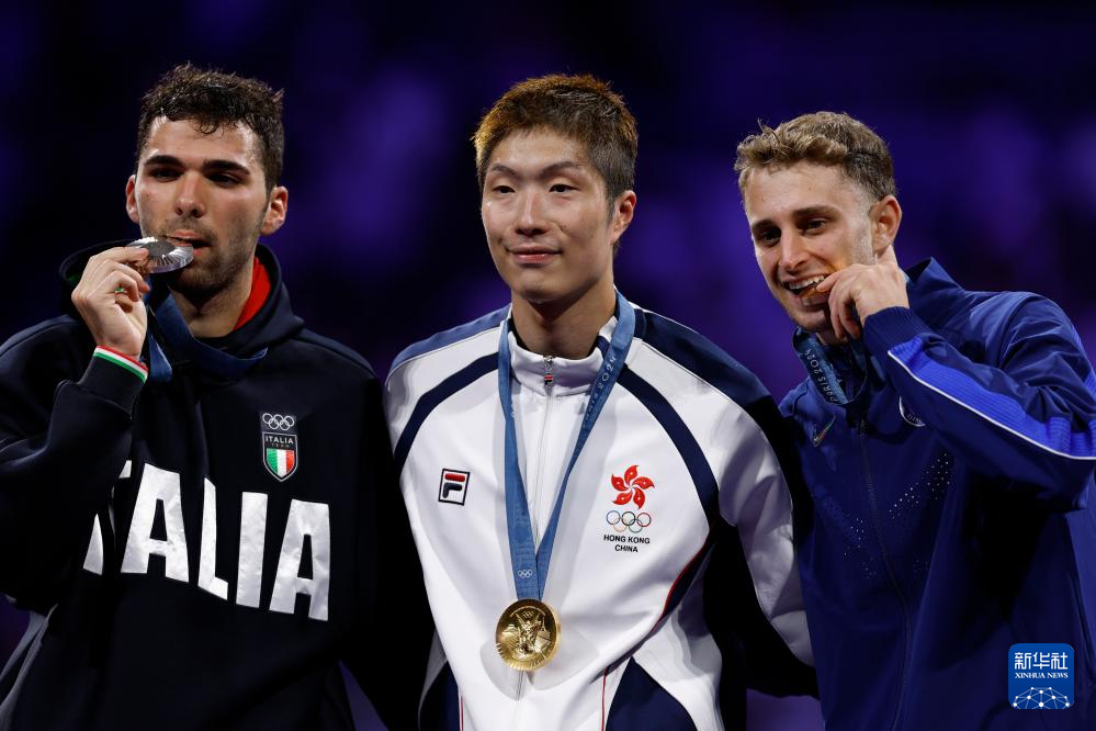 7月30日,冠军中国香港选手张家朗(中)、亚军意大利选手菲利波·马基(左)与季军美国选手伊特金在颁奖仪式上。