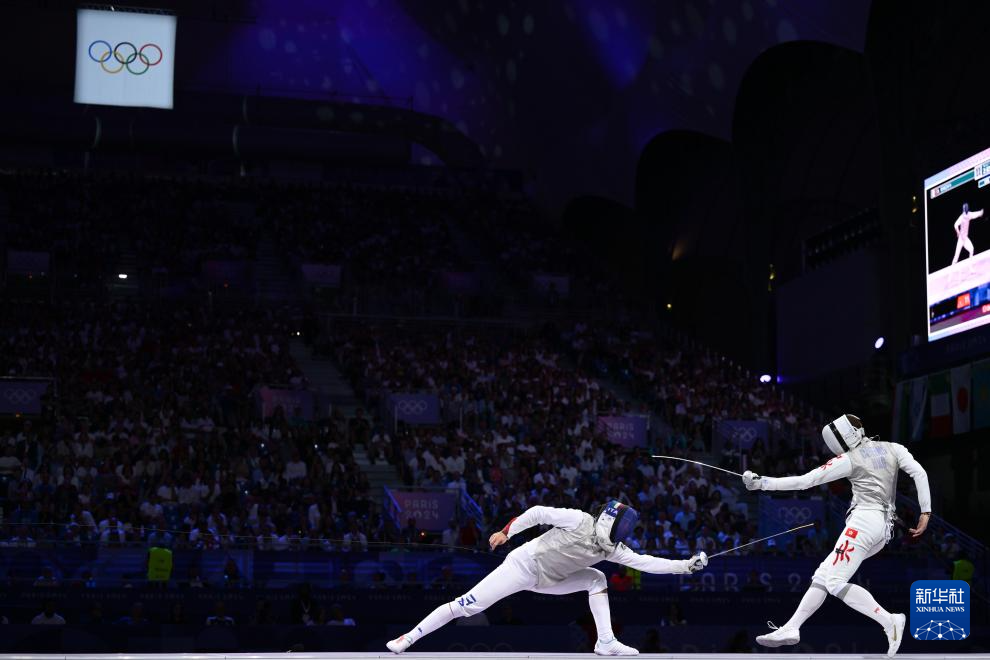 7月29日,中国香港选手张家朗(右)与意大利选手菲利波·马基在比赛中。
